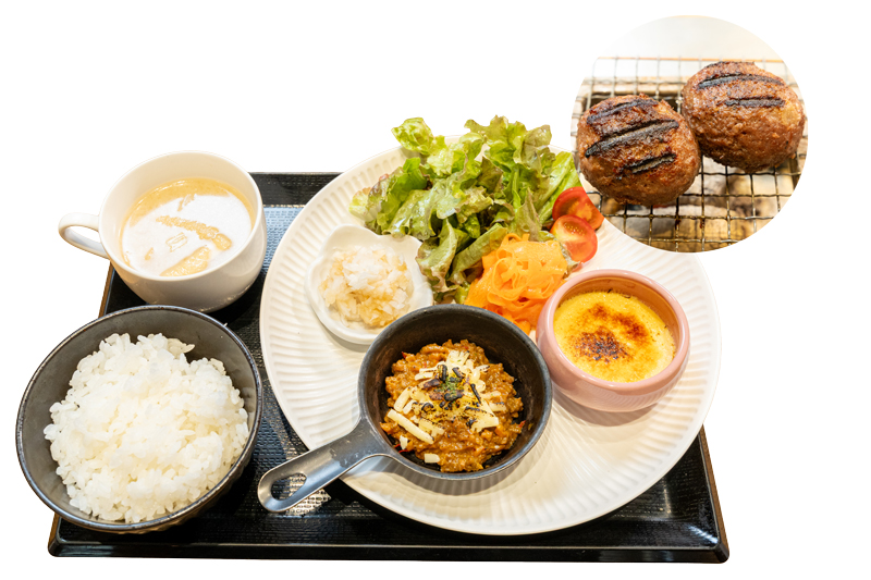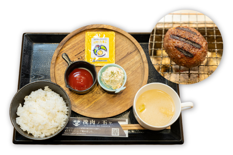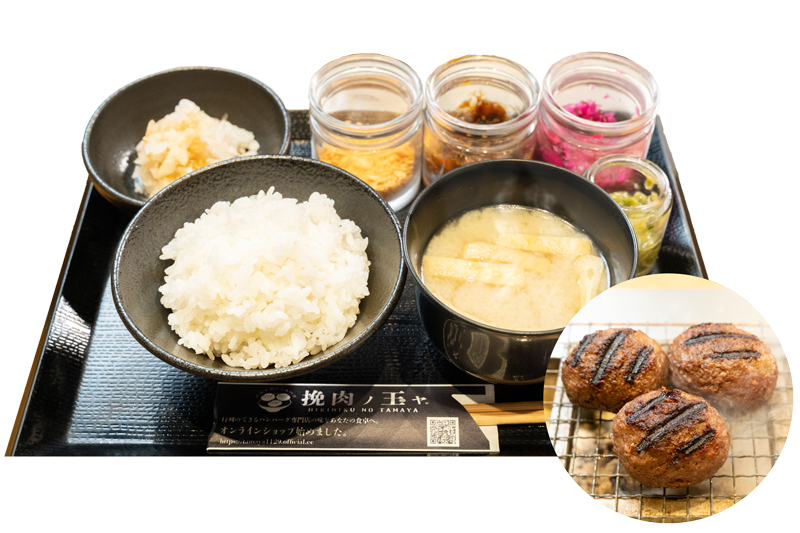 挽肉玉×3、ごはん、味噌汁、薬味、卵、牛すじ煮込み、玉ヤのポテサラ、選べるトッピング又はおつまみから1種、食後の幸せアイス、お好きなソフトドリンク